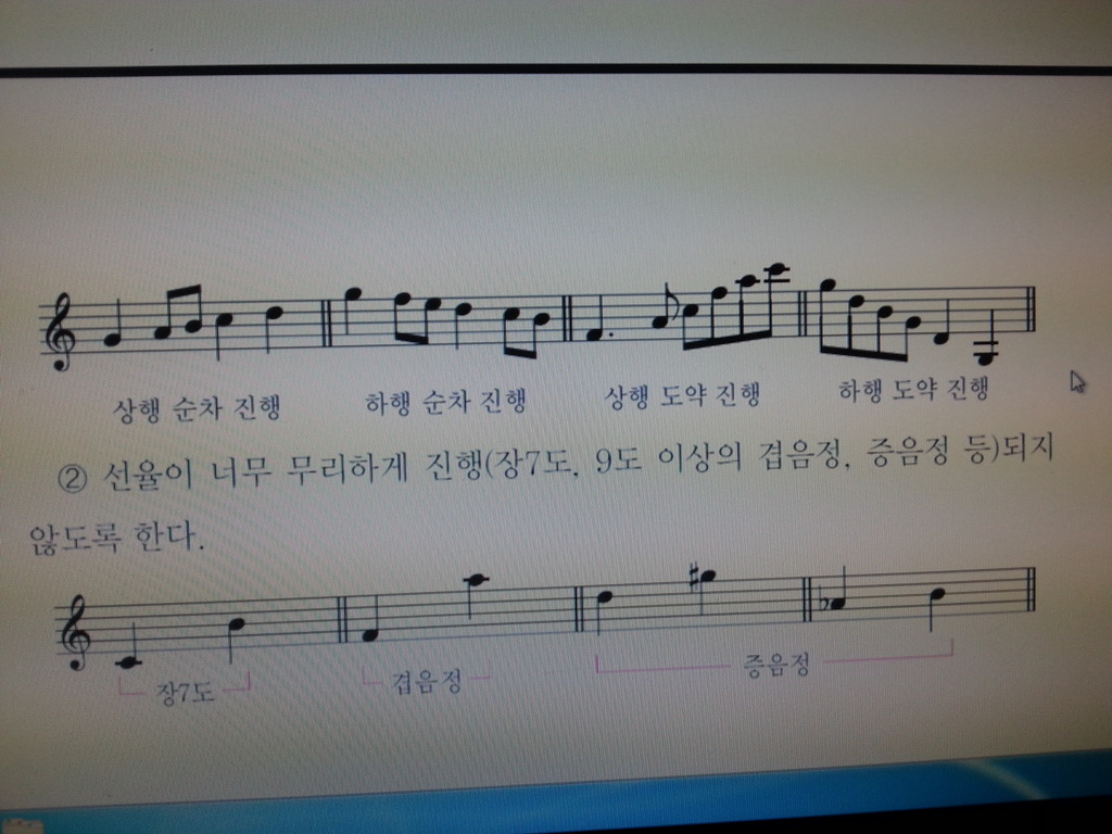 성부의 진행은 순차진행과 도약진행이 있다 순차진행은 선율이 2도차이로 진행하는 것을 말하며 도약진행은 선율이 3도이상 건너 뛰어 진행하는 것을 말한다 이것은 화음의 수평적 진행이다.적절히 사용하여야 아름다운 선율을 만들수가 있다 도약진행에 있어서는 너무 무리하게 건너뛰면 안된다.장7도,9도이상의 겹음정,증음정은 좋치않다![]()