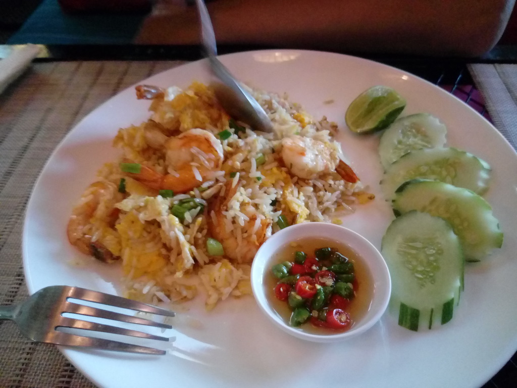 터미널 안에는 2-300밧 짜리 싸구려 숙소들이 보였지만 무시하고, 큰길 건너편 반샘품 호텔을 찾아가 550밧을 주고 방을 얻었다. 방에서 쉬다가 다시 큰길을 건너 터미널 옆 골목 안에서 찾아낸 카페 데림이라는 (작지만) 깔끔한 식당에서 저녁을 먹음.