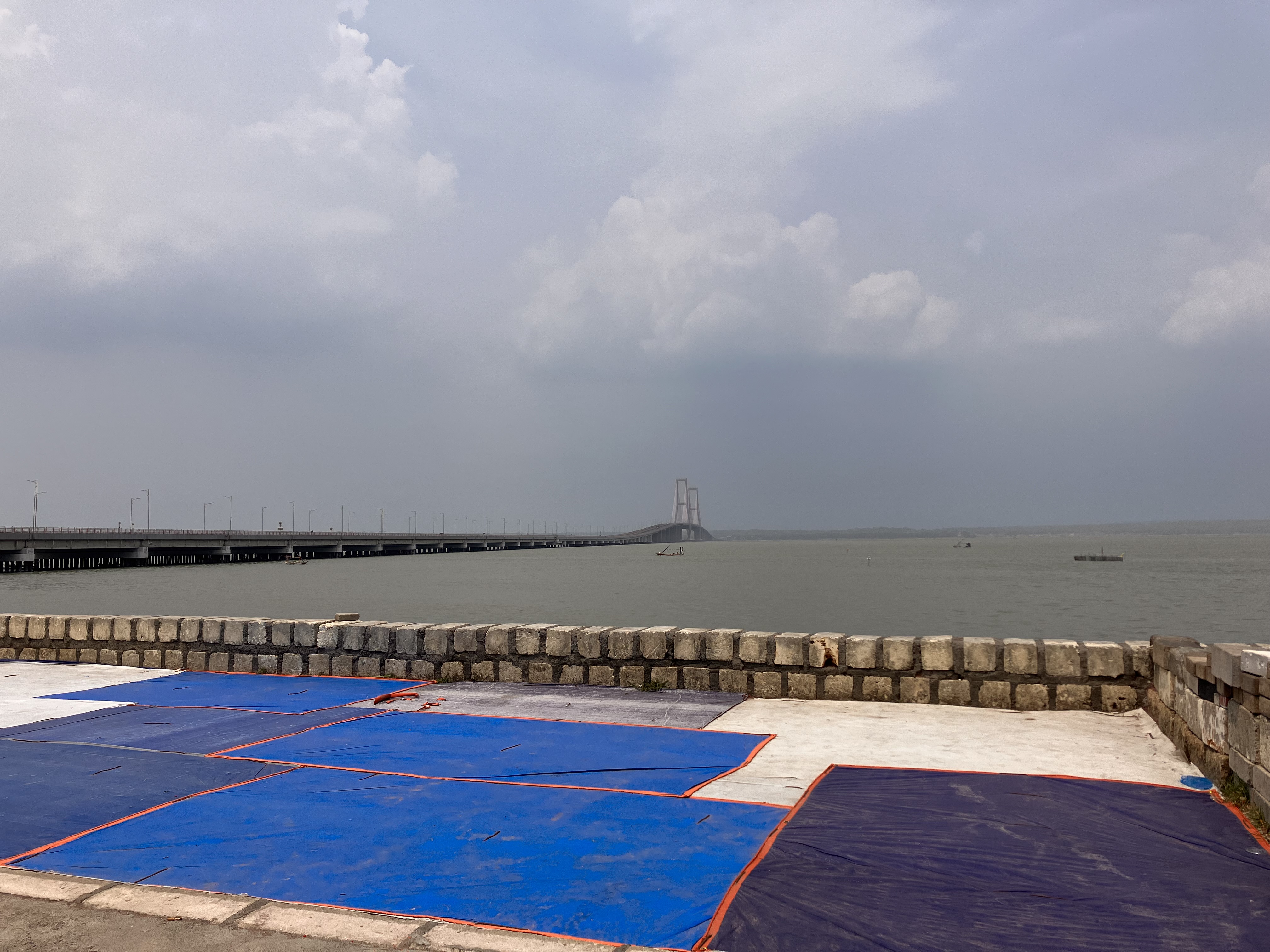 옆 건물은 그냥 평범한 선착장 대합실이다. 앉아서 시간을 보낼 만한 곳도 없고 해서 다시 그랩을 불러 (선착장 안으로는 그랩이 못 들어와서 한참을 걸어나와서 탔다.) 수라마두 대교로 갔다. 수라바야와 마두라 섬을 잇는 큰 다리가 관광 명소라는데, 막상 현장에 가 보니 썰렁한 분위기다. 다리 밑에 도시락 싸온 사람들 몇몇이 앉아 있고 근처에 싸구려 식당 몇 채가 보이는 정도, 멋진 전망대를 기대했던 우리로서는 실망 그 자체.