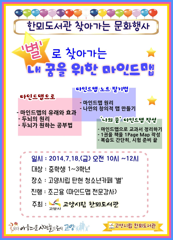 고양시(시장 최성) 한뫼도서관에서 고양시립탄현청소년카페 ‘별’(이하 ‘별’)로 찾아가는 ‘내 꿈을 위한 마인드맵 특강’을 오는 7월 18일 금요일 오전 10시에 덕이중학생을 대상으로 진행할 예정이다.