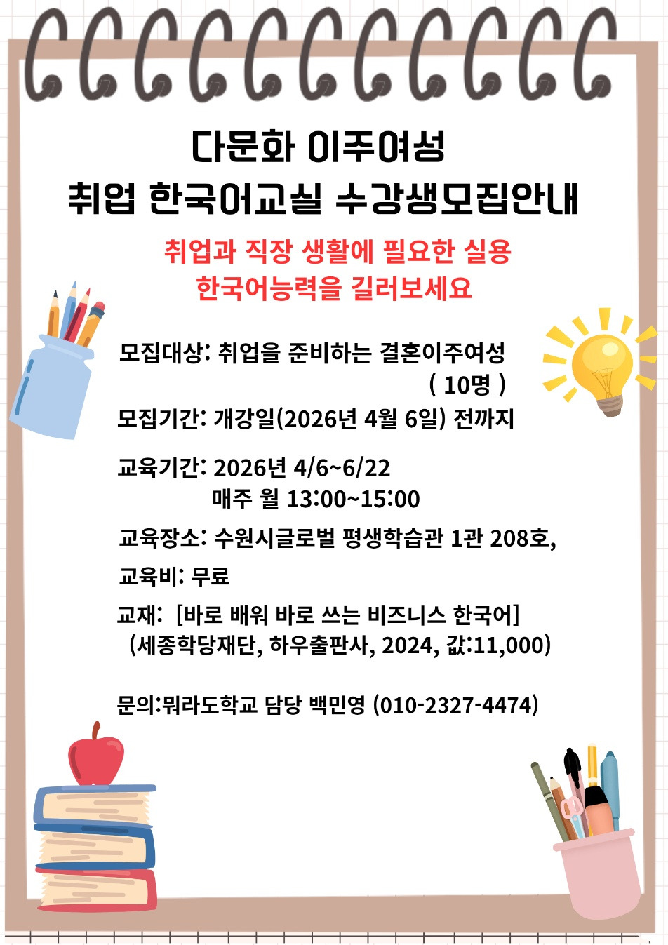 다문화이주여성 취업한국어교실 수강생 모집안내 작성자백민영|작성시간26.03.12|조회수9 목록 댓글 0 글자크기 작게가 글자크기 크게가 다음검색 현재 게시글 추가 기능 열기 북마크 공유하기 신고 센터로 신고 댓글 댓글 0 댓글쓰기 답글쓰기 댓글 리스트