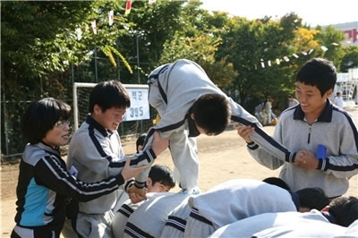 <단체 경기-등 밟고 뛰기를 하는 1학년 남학생들, 협동심이 필요하죠...안전사고 주의는 필수~ >
