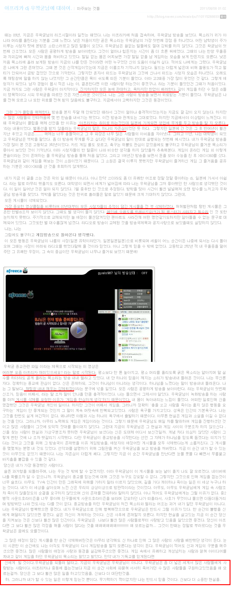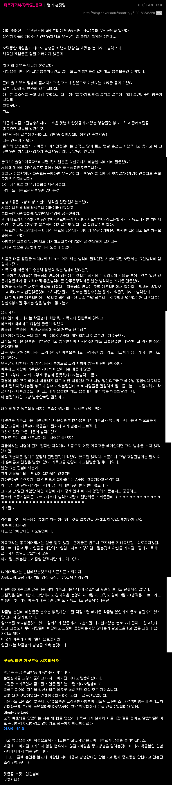우왁굳이라고 한 1~2년 전에 아프리카 별창을 존나 많을때 당당히 남자 게다가 게임 방송으로 5위 안에 들던 놈임 그런데 갑작스레 일본 유학길에 떠나면서 방송을 접고 다시 돌아오리라 약속을 했는데 얼마전 갑자기 컴백 한뒤에 방송이 개독 찬양 방송으로 바뀌었음... 자기 아프리카에 있던 방송 녹화 한거 다 지워버리고 과거를 청산 하고 지금까지의 무식하기만 했던 아프리카 방송을 새롭게 바꾼다고 시작하는 방송... 밑에는 과거 개독이 되기전 방송들... 이건 예전의 우왁굳이 어떗는지를 보여주는 방송들... ( 아프리카 방송 다 삭제해서 이렇게 네이버 플레이어 아니면 보지도 못하게됬음.. ) 저렇게 병신력이 투철하고 재밋는 게임 방송에 투자 하던 사람 이었는데.. 갑작스레...