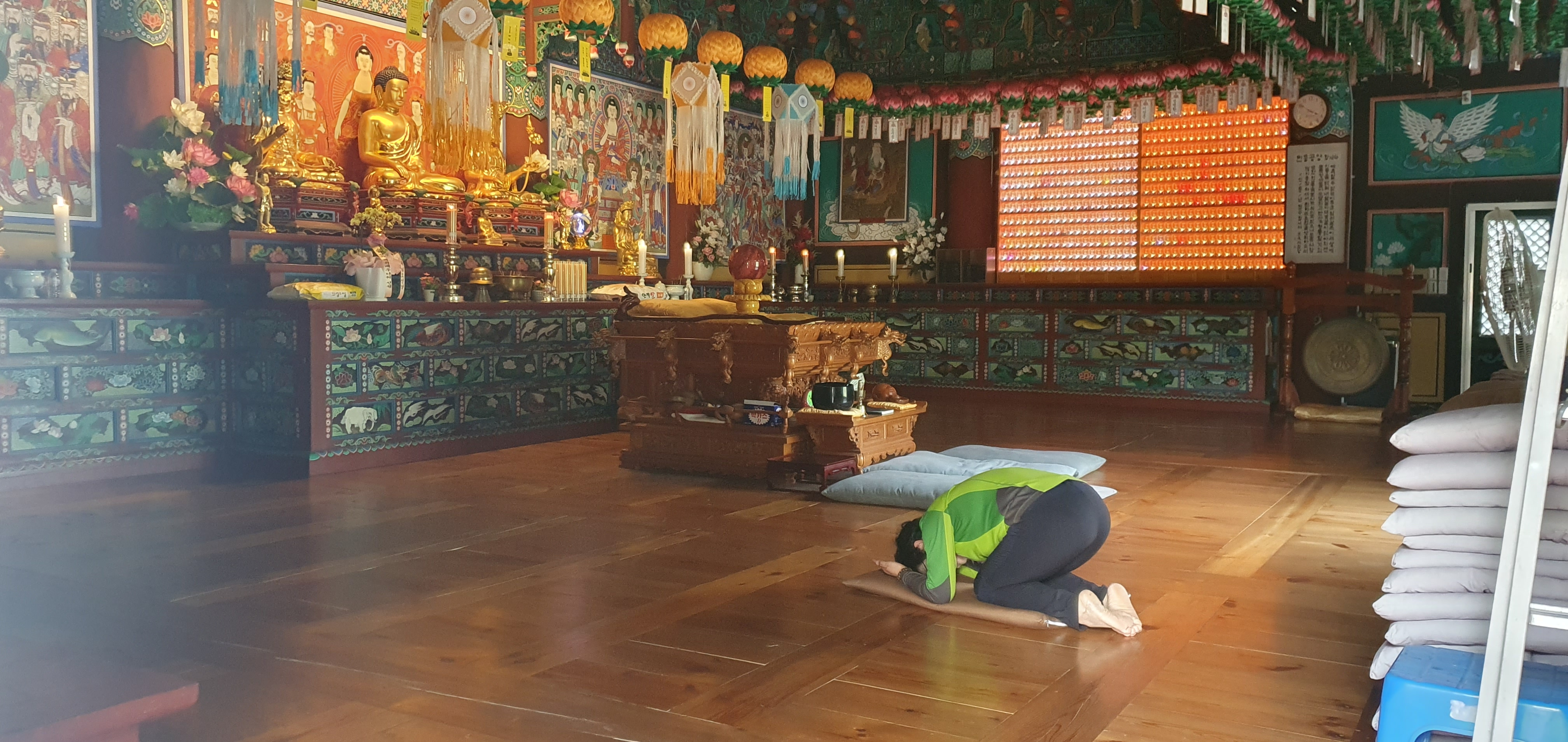 불심깊은 여산우가 보국사 대웅전에서 기도를 드리고 있습니다
