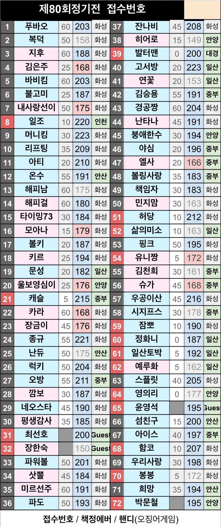 주황색 숫자 는 추첨대상에서 제외 입니다.