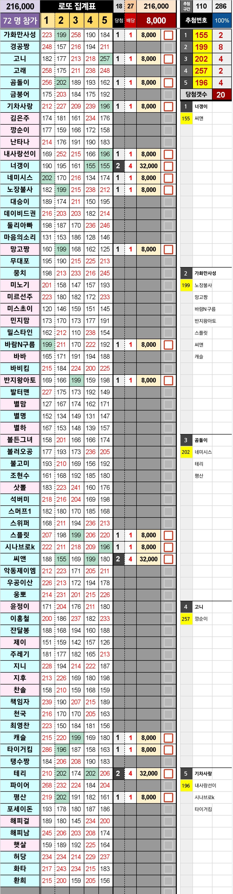 게임 종료후 시상때 5개 번호를 랜덤 추첨.