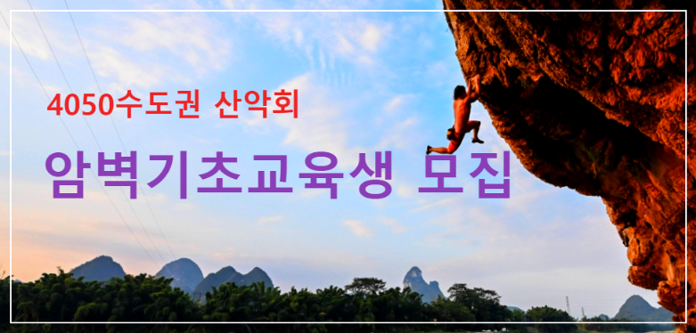 | 4050수도권 산악회 암벽반에서는 2026년 암벽기초 교육생을 모집합니다. 21기수를 맞은 수도권 암벽반은 그 동안 기초교육을 통해 '뿌리가 튼튼한' 암벽인들을 배출해 왔습니다. 암벽에 대한 넓은 이해와 경험을 갖춘 강사진들이 참여해 이번에도 이론과 실전 교육을 펼쳐나갈 예정입니다. 암벽에 대한 기초를 다지고 더 넓은 암벽인의 세계를 희망하는 회원 여러분들의 참여를 기다립니다. | |