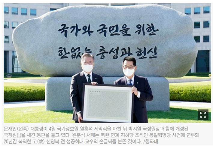 “북한 간첩 신영복 글씨”체로 국정원의 교훈인 원훈석(院訓石)을 다시 세워