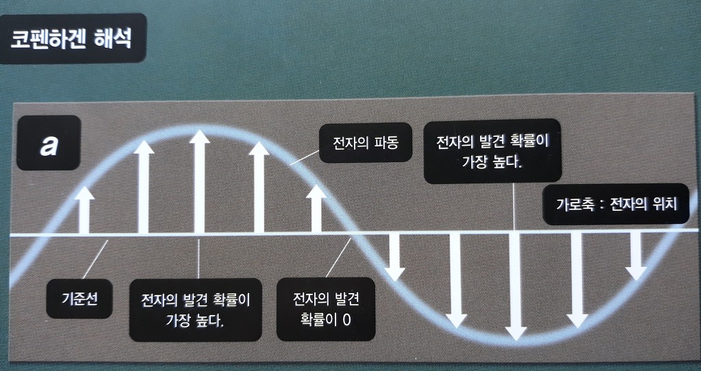 그림 a와 같은 전자의 파동이 존재할 때 전자의 위치를 관측하면 마루의 꼭대기와 골의 바닥, 즉 진폭이 최대인 곳에서 전자의 발견 확률이 최대가 된다. 한편 진폭이 0인 지점에서는 전자의 발견 확률은 0이 된다. 즉 파동의 진폭 크기가 전자의 발견 확률과 관련을 갖는다.
