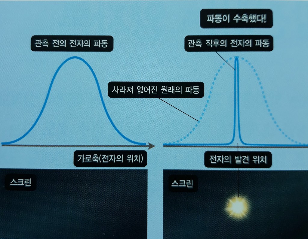 전자의 위치를 확인하려고 ‘관측’을 하면, 공간에 너비를 가지고 퍼져 가던 전자의 파동이 바늘 모양의 너비가 없는 파동으로 ‘수축’한다. 그리고 파동이 수축한 위치에서 전자가 발견된다.