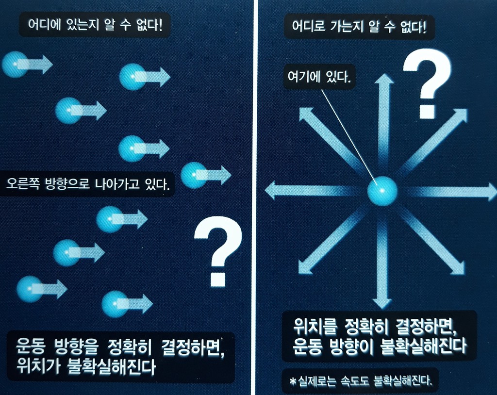 전자의 위치와 운동량(질량×속도)을 동시에 정확히 결정하는 것은 불가능하다. 전자의 위치를 정확히 결정하면, 운동량이 불확실해진다. 반대로 운동량을 정확히 결정하면, 위치가 불확실해진다. 여기서 말하는 ‘불확실’이란 ‘진짜로는 결정되어 있지만 인간은 알 수 없다.’는 의미가 아니다. ‘많은 상태가 공존하고 있고, 그 후 실제로 인간이 어느 상태를 관측할지 결정되어 있지 않다.’는 것을 의미한다.
