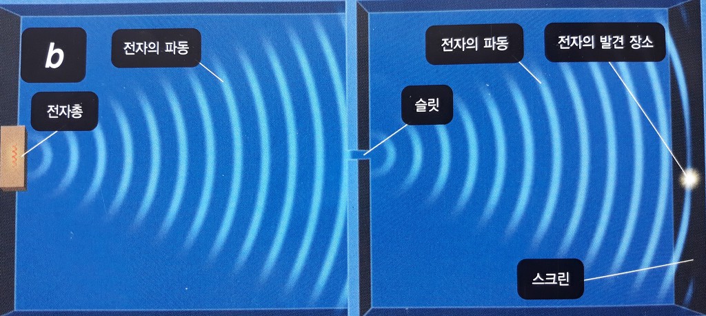 다음으로 그림 b와 같이 전자의 파동이 스크린에 부딪히면 전자는 파동에서 입자의 모습으로 나타난다. 이것은 전자가 파동과 입자의 이중성임을 증명해주는 것이다.
