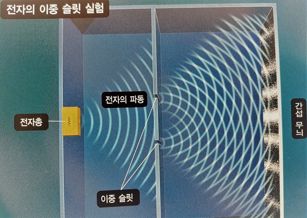 전자의 이중 슬릿 실험을 하면 스크린에 간섭무늬가 나타난다. 전자가 단순한 입자라면 간섭무늬는 나타나지 않는다. 전자는 광자와 같이 입자와 파동의 성질을 공존하고 있다.