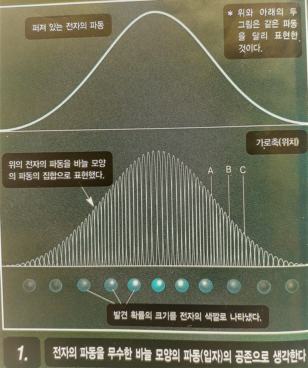이러한 입자로서의 전자는 너비를 갖지 않는 바늘 모양의 파동에 해당한다(그림 c). 이것은 입자로서의 전자가 어느 한 지점에서 반드시 발견되듯이, 바늘 모양의 전자의 파동도 어느 한 지점에서 반드시 전자가 발견된다는 것을 의미하기 때문이다.