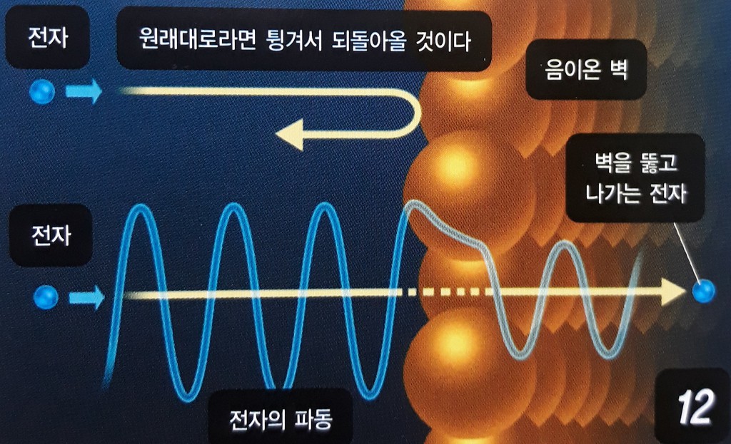 전자와 같은 미시 입자는 본래는 빠져나갈 수 없는 벽을 뚫고 나갈 수 있다. 이것은 입자가 파동의 성질을 함께 갖기 때문에 일어나는 현상이다.