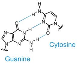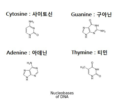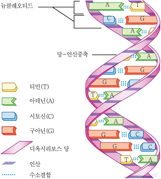 DNA는 당-인산의 뼈대에 실질적인 정보 메시지를 전달하는 구아닌(G), 시토신(C), 티민(T), 아데닌(A)이라는 4종류의 염기로 구성된 핵산 두 가닥이 나선형으로 꼬인 이중나선 모양이다. 이중나선형의 결정적 특징은 두 개의 가닥 중 한 가닥에 들어 있는 정보, 즉 염기 서열이 다른 가닥의 것과 상보적이라는 점이다. 즉, 한쪽 가닥에 있는 A는 항상  다른 쪽 가닥의 T와 결합하고, G는 항상C와 결합한다.