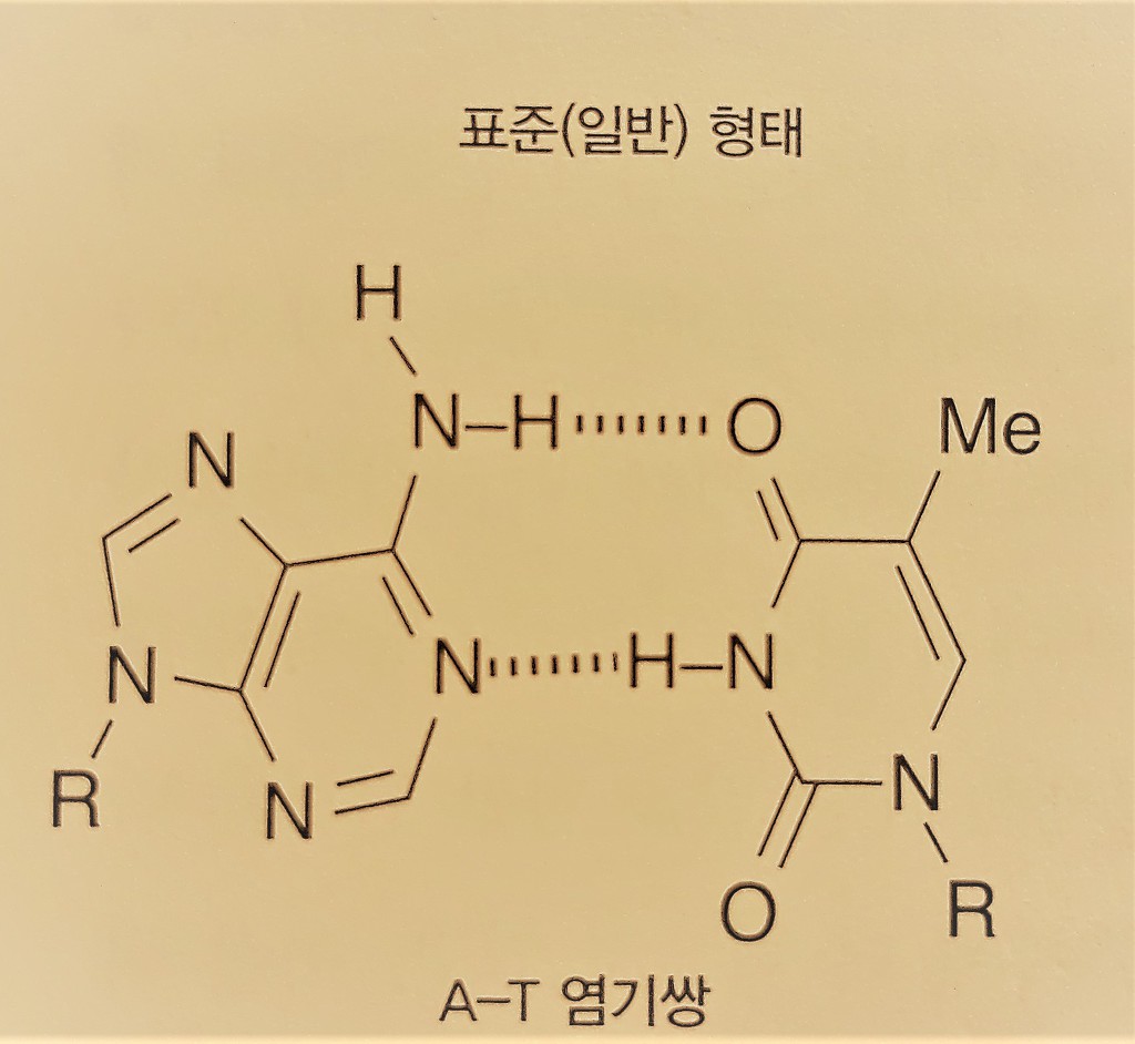 이런 비대칭성은 대단히 중요한 DNA의 특징을 만들며, A-T염기쌍의 경우 그림 1과 같은 양성자 위치가 표준(일반) 형태다.
