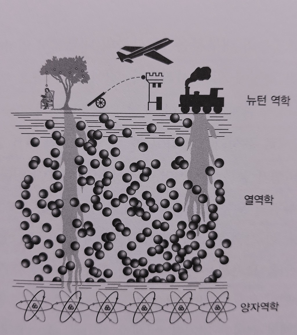 표면에는 축구공, 기차, 비행기 같은 거시적이고 일상적인 사물이 있다. 이런 사물의 움직임은 뉴턴의 운동법칙을 따르며, 뉴턴의 운동법칙은 속도, 가속도, 운동량,  힘 같은 친숙한 개념과 연관이 있다. 중간에는 액체와 기체의 움직임을 묘사하는 열역학 층이 있다. 열역학 층에도 동일한 고전적인 뉴턴의 운동법칙이 적용된다. 세 번째이자 가장 깊은 곳에는 실재의 기반이 되는 양자세계가 있다. 양자세계는 원자와 분자가 움직이는 곳이며, 이 입자들을 지배하고 정확하고 질서정연한 법칙은 고전역학이 아니라 양자역학이다. 그러나 기이한 양자 현상은 대부분 우리 눈에 잘 보이지 않는다. 이중 슬릿 실험 같은 것을 통해서나 개개의 분자를 면밀히 관찰할 때에만 우리는 양자법칙을 더 심도 있게 관찰할 수 있다.