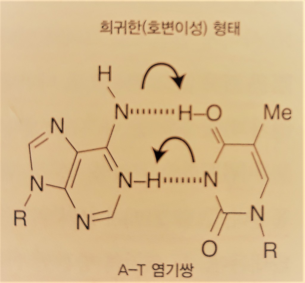 그러나 그림 2와 같이 쌍을 이룬 양성자가 이중나선 건너편으로 도약해서 양성자 위치가 뒤바뀌어진 희귀한(호변이성체)의 형태를 취할 수도 있다. 이렇게 되면 DNA가 복제될 때 정상적 상보적 결합(A:T, G-C)이 되지 못하고 비정상적인 A:G, T:C 결합이 되는 돌연변이가 생길 수가 있다.