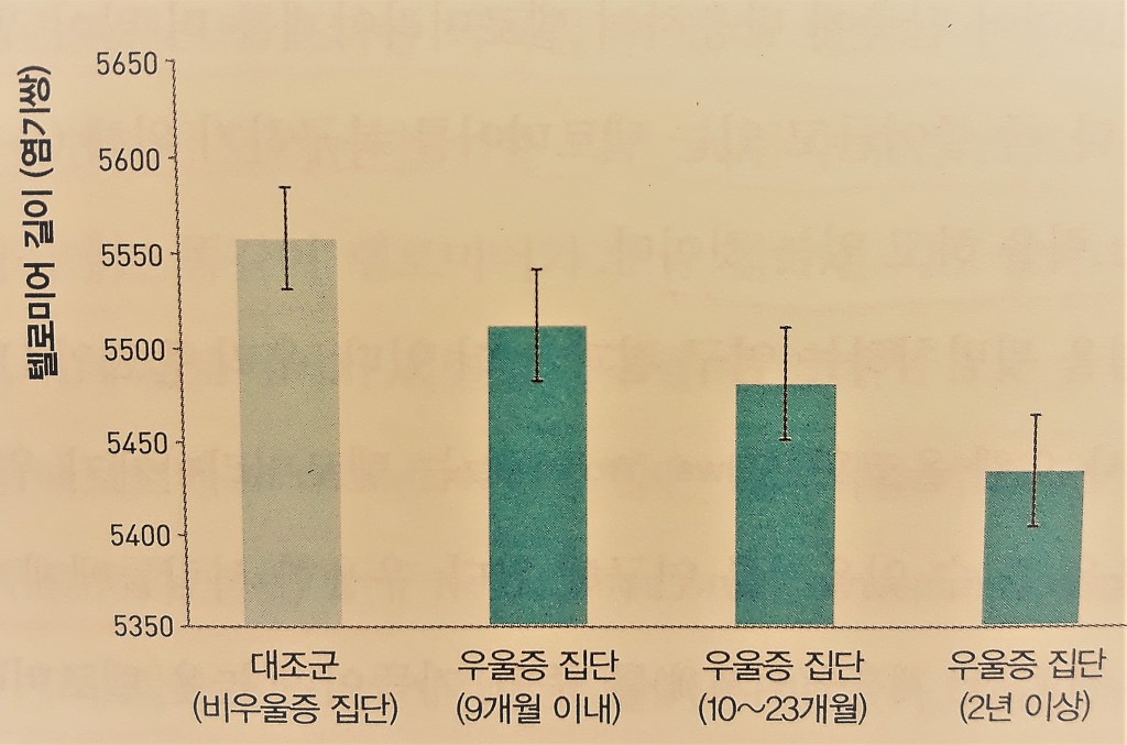 우울한 사람들에게 항우울제를 주면 가뜩이나 높은 텔로머라아제 농도가 더욱 치솟는다. 텔로머라아제 농도가 높아질수록 우울증이 심해질 가능성도 더 커진다. 면역세포가 잃은 텔로미어를 보충하려고 애쓰는 것과 흡사한 행동이 뇌에서도 일어날 수 있다.