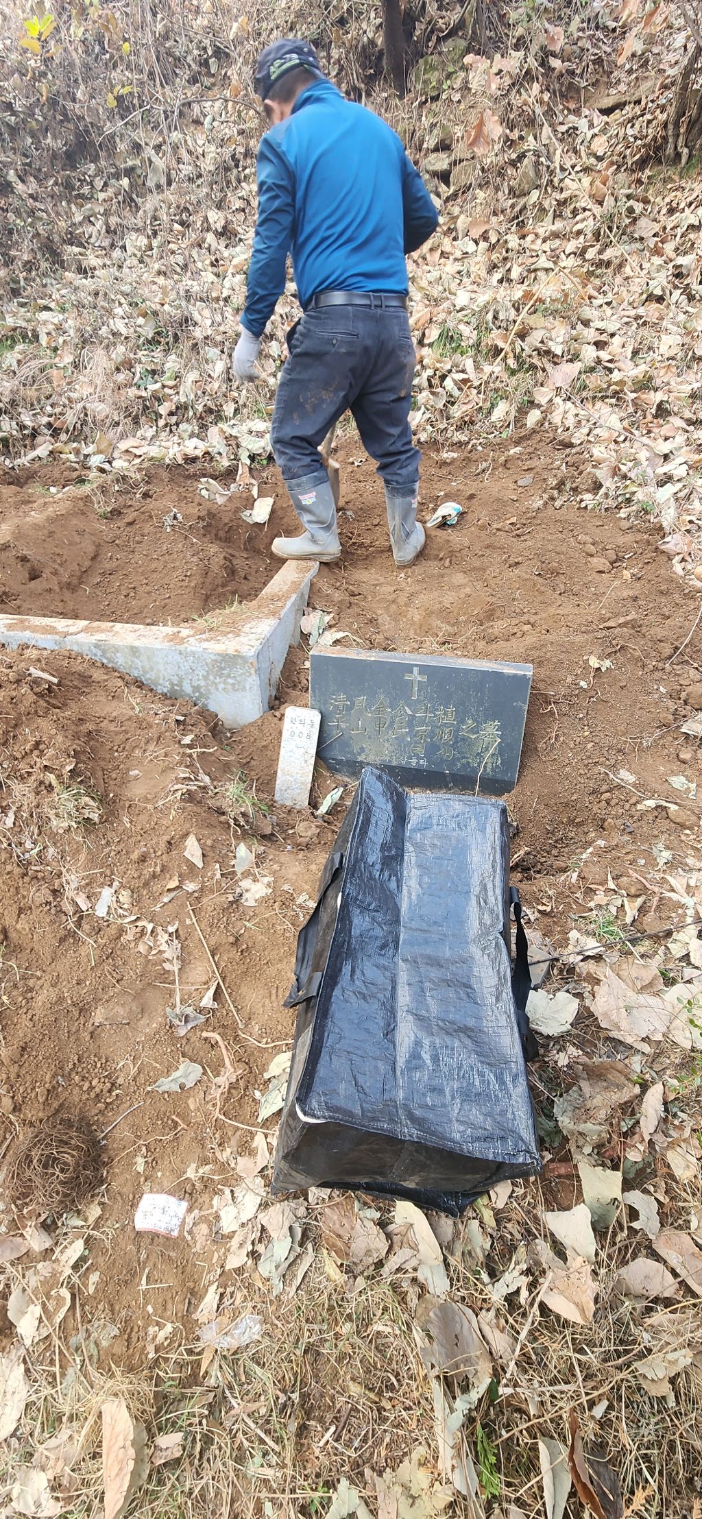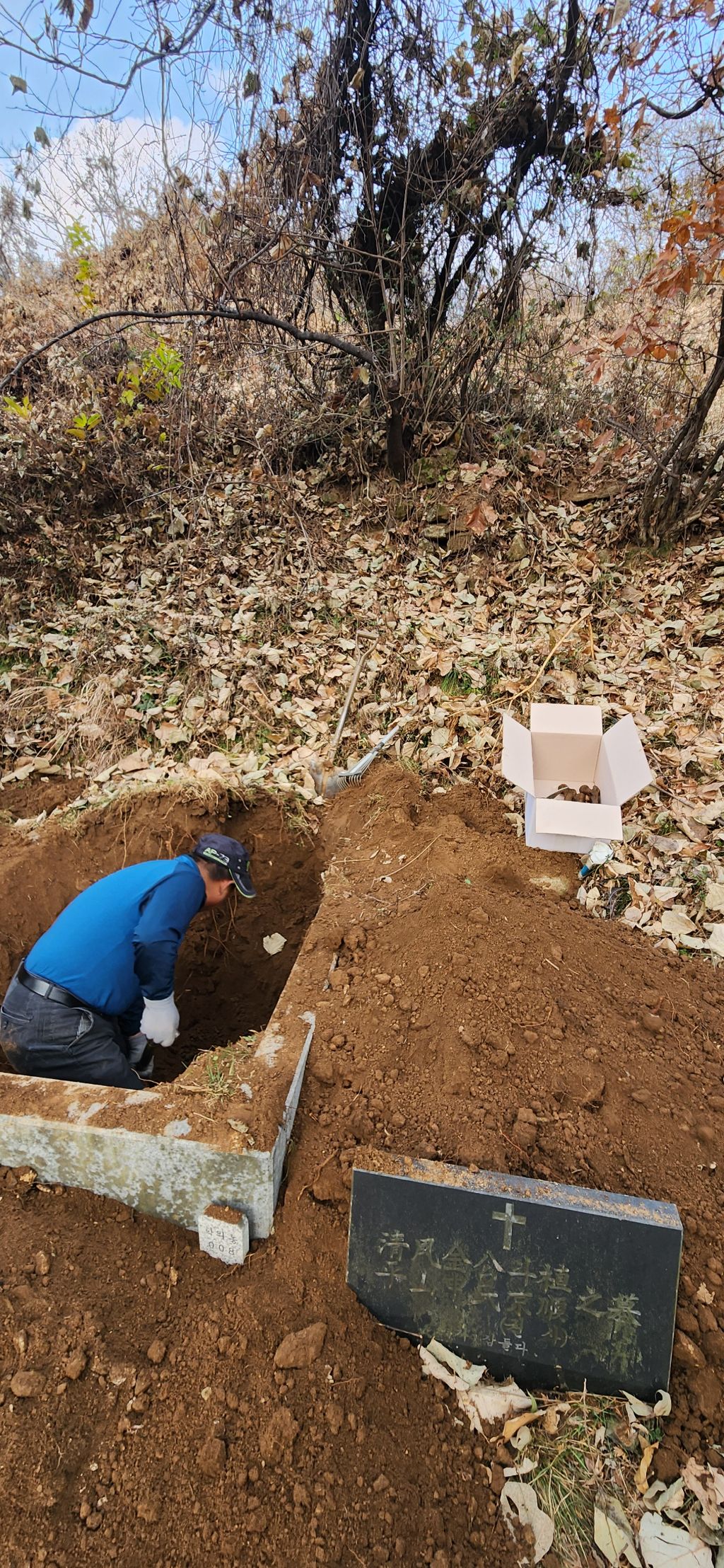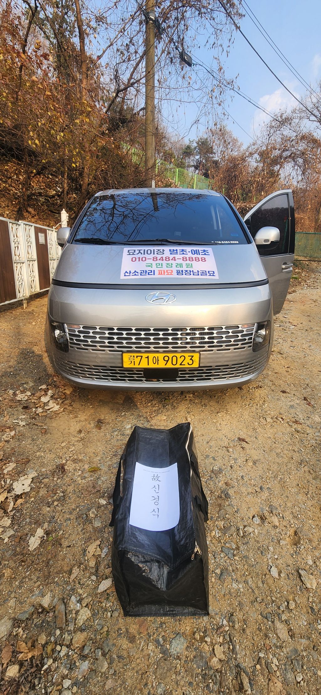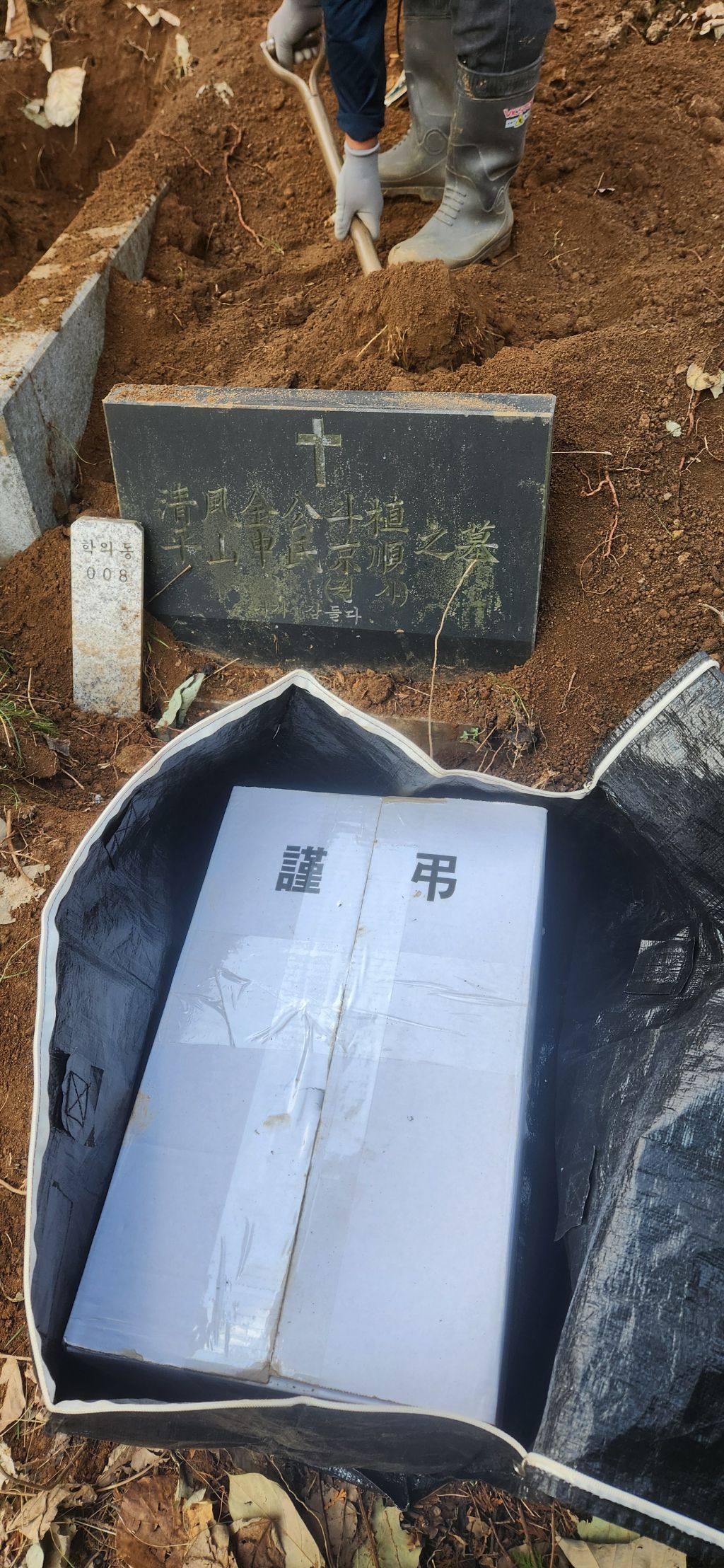 이장 개장 파묘 화장 의왕시 학의동 산14 학의동공설묘지 산소 분묘1기를 파묘하여 유골을 수습하여 종이관에 모셔서 노랑색번호판 운구차