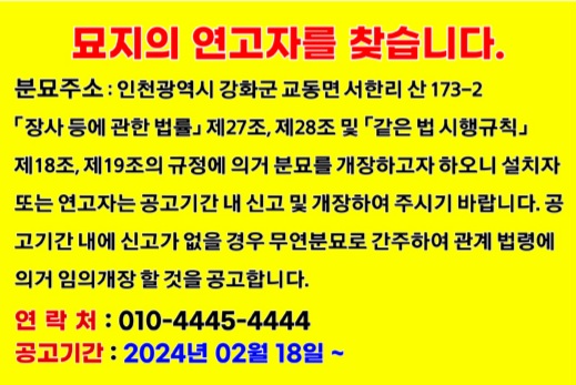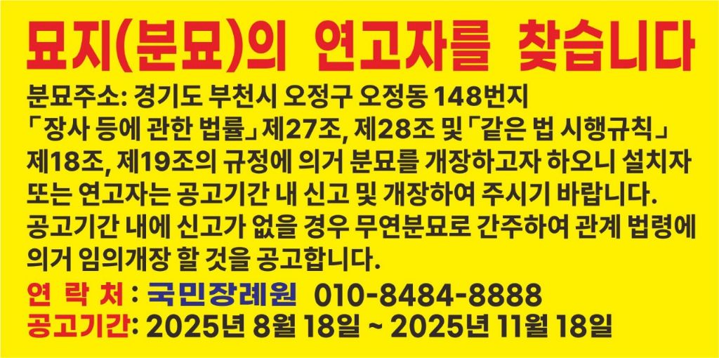 무연고분묘 개장공고 부천시 오정구 오정동 148번지 작성자森焱 朴鐘閏 仁忍人|작성시간25.08.26|조회수23 목록 댓글 0 글자크기 작게가 글자크기 크게가 공사현장 유골발견 현장조사 다음검색 현재 게시글 추가 기능 열기 북마크 신고 센터로 신고 댓글 댓글 0 댓글쓰기 답글쓰기 댓글 리스트