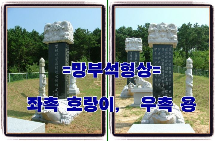망부석에는 일명 “하늘 다람쥐”“도룡뇽” 형상을 한 "세호(勢護)"가 새겨져 있다. 망주석(望柱石) : 혼이 놀러갔다가 망주석을 보고 찾아올 수 있도록 하기 위하여 무덤 양옆에 세운 돌기둥으로 혼이 망주석에 새겨진 도룡뇽을 타고 봉분 안으로 드나든다고 한다.