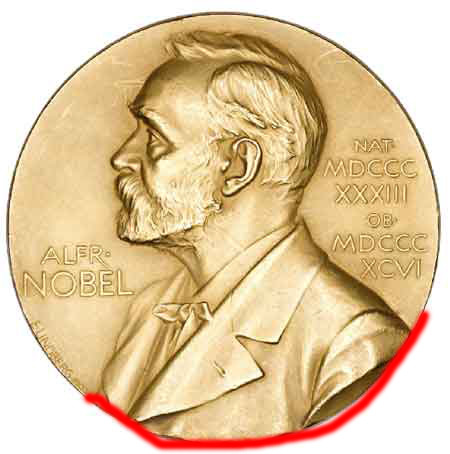 금속으로 만든 모조 노벨상 메달은 진짜 노벨상 메달의 디자인을 따릅니다.(노벨 재단의 허락을 바지 않고 만드는 모조 노벨상 메달은 야매임)