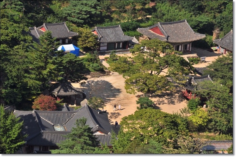 위 사진은 삼랑산성(三郞山城) 위에서 내려다 본 전등사의 전경(全景)이다. 국가사적 제130호로 지정되어있는 삼랑산성은 삼국시대 토성(土城)의 흔적을 간직하고 있으며, 고려시대에 이어 조선시대에서도 산성을 보수하거나 새롭게 쌓은 기록이 전해지고 있다. 삼랑산성은 타 지역의 산성과는 달리, 성내(城內)에는 오직 전등사만이 있기 때문에 역사성(歷史性)과 희귀성(稀貴性)을 함께 간직한 산성으로 유명하다.