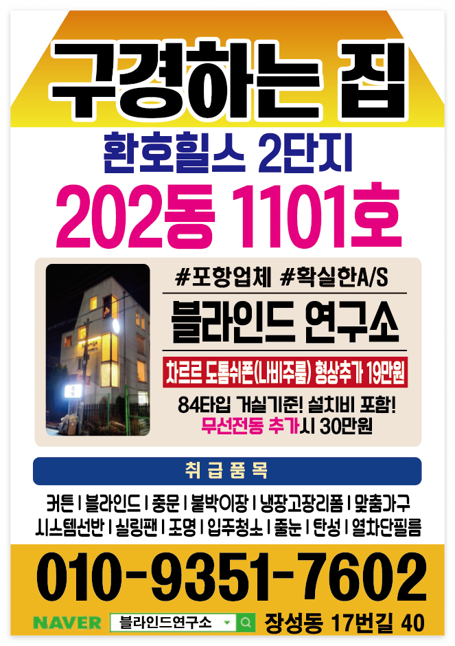 힐스테이트 환호공원 구경하는 집 오픈!! 작성자아크건축|작성시간25.11.19|조회수59 목록 댓글 0 글자크기 작게가 글자크기 크게가 아크건축&블라인드 연구소 환호힐스 구경하는집 오픈!! 포항시 전지역 구경하는집 공동구매가로 진행해 드립니다.힐스테이틑 84B타입 거실 도톰 차르르 쉬폰 전동시공 사진!!아이들방 인기만점!!! 레이져롤스크린 시공 사진입니다. 다음검색 현재 게시글 추가 기능 열기 북마크 공유하기 신고 센터로 신고 댓글 댓글 0 댓글쓰기 답글쓰기 댓글 리스트