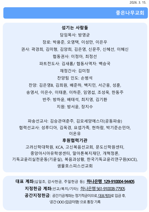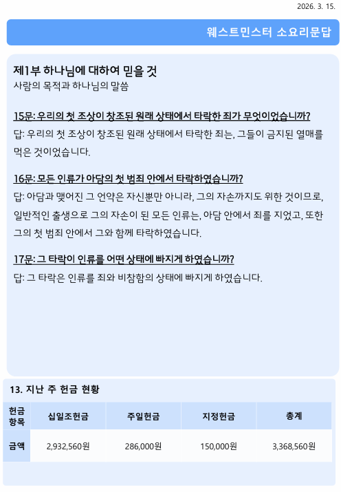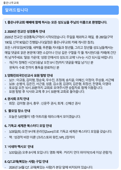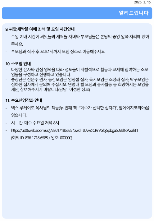 2026년 3월 15일 주보 작성자김미정|작성시간26.03.15|조회수74 목록 댓글 0 글자크기 작게가 글자크기 크게가 20260315 주보.pdf610.38KB 첨부파일첨부된 파일이 9개 있습니다. png 파일 스크린샷 2026-03-15 095616.png 다운로드 png 파일 스크린샷 2026-03-15 095627.png 다운로드 png 파일 스크린샷 2026-03-15 095637.png 다운로드 png 파일 스크린샷 2026-03-15 095645.png 다운로드 png 파일 스크린샷 2026-03-15 095652.png 다운로드 png 파일 스크린샷 2026-03-15 095659.png 다운로드 png 파일 스크린샷 2026-03-15 095706.png 다운로드 png 파일 스크린샷 2026-03-15 095715.png 다운로드 pdf 파일 20260315 주보.pdf 다운로드 다음검색 현재 게시글 추가 기능 열기 북마크 신고 센터로 신고 댓글 댓글 0 댓글쓰기 답글쓰기 댓글 리스트