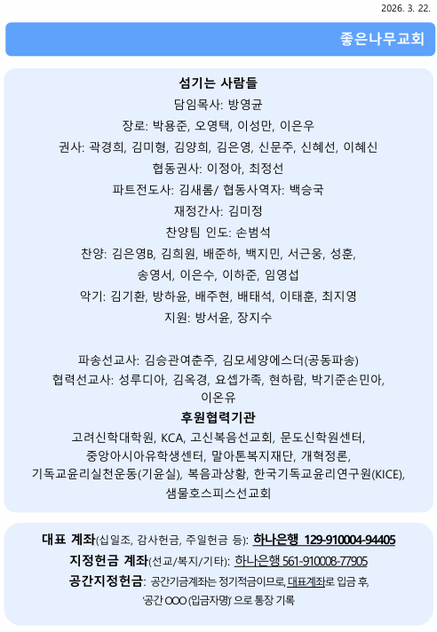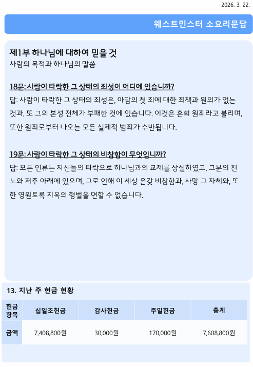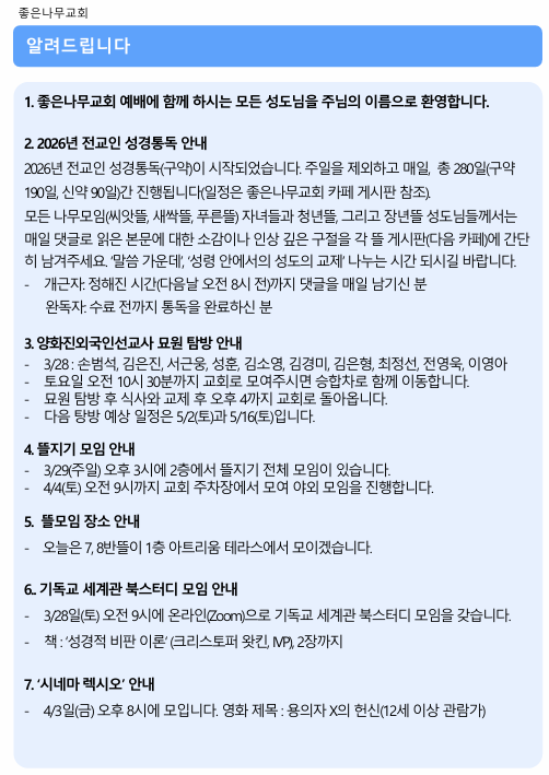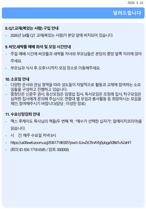 2026년 3월 22일 주보 작성자김미정|작성시간26.03.22|조회수61 목록 댓글 0 글자크기 작게가 글자크기 크게가 20260322 주보.pdf612.94KB 첨부파일첨부된 파일이 9개 있습니다. png 파일 스크린샷 2026-03-22 101413.png 다운로드 png 파일 스크린샷 2026-03-22 101420.png 다운로드 png 파일 스크린샷 2026-03-22 101428.png 다운로드 png 파일 스크린샷 2026-03-22 101435.png 다운로드 png 파일 스크린샷 2026-03-22 101440.png 다운로드 png 파일 스크린샷 2026-03-22 101448.png 다운로드 png 파일 스크린샷 2026-03-22 101455.png 다운로드 png 파일 스크린샷 2026-03-22 101502.png 다운로드 pdf 파일 20260322 주보.pdf 다운로드 다음검색 현재 게시글 추가 기능 열기 북마크 신고 센터로 신고 댓글 댓글 0 댓글쓰기 답글쓰기 댓글 리스트