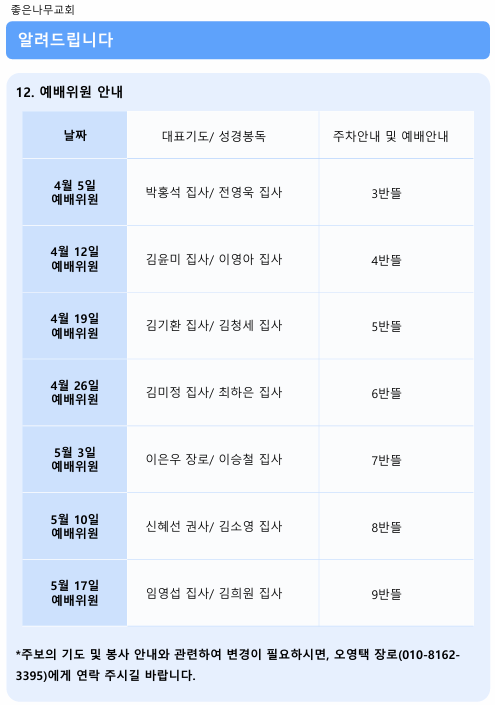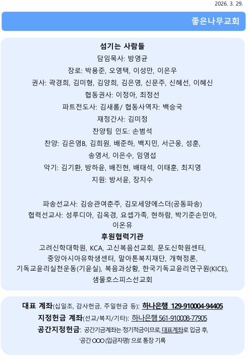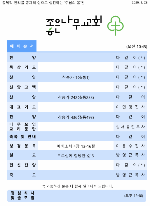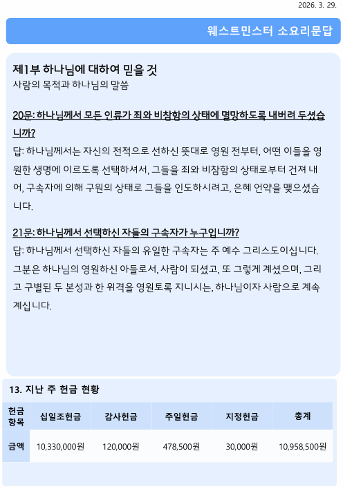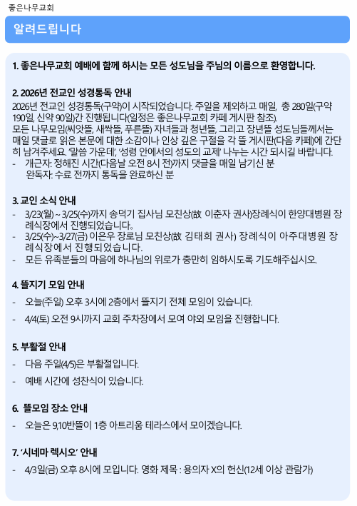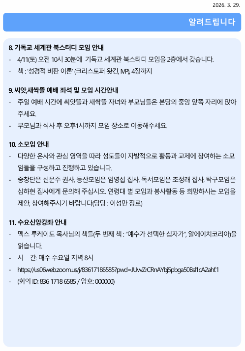 2026년 3월 29일 주보 작성자김미정|작성시간26.03.29|조회수30 목록 댓글 0 글자크기 작게가 글자크기 크게가 20260329 주보.pdf609.49KB 첨부파일첨부된 파일이 9개 있습니다. png 파일 스크린샷 2026-03-29 095616.png 다운로드 png 파일 스크린샷 2026-03-29 095624.png 다운로드 png 파일 스크린샷 2026-03-29 095631.png 다운로드 png 파일 스크린샷 2026-03-29 095639.png 다운로드 png 파일 스크린샷 2026-03-29 095644.png 다운로드 png 파일 스크린샷 2026-03-29 095651.png 다운로드 png 파일 스크린샷 2026-03-29 095658.png 다운로드 png 파일 스크린샷 2026-03-29 095705.png 다운로드 pdf 파일 20260329 주보.pdf 다운로드 다음검색 현재 게시글 추가 기능 열기 북마크 신고 센터로 신고 댓글 댓글 0 댓글쓰기 답글쓰기 댓글 리스트