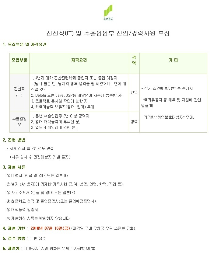 [스크랩] 미쓰이스미토모은행서울지점 채용 / 미쓰이스모토모은행서울지점 전산직(IT) 및 수출입업무 신입&경력사원 채용 (~7/16)