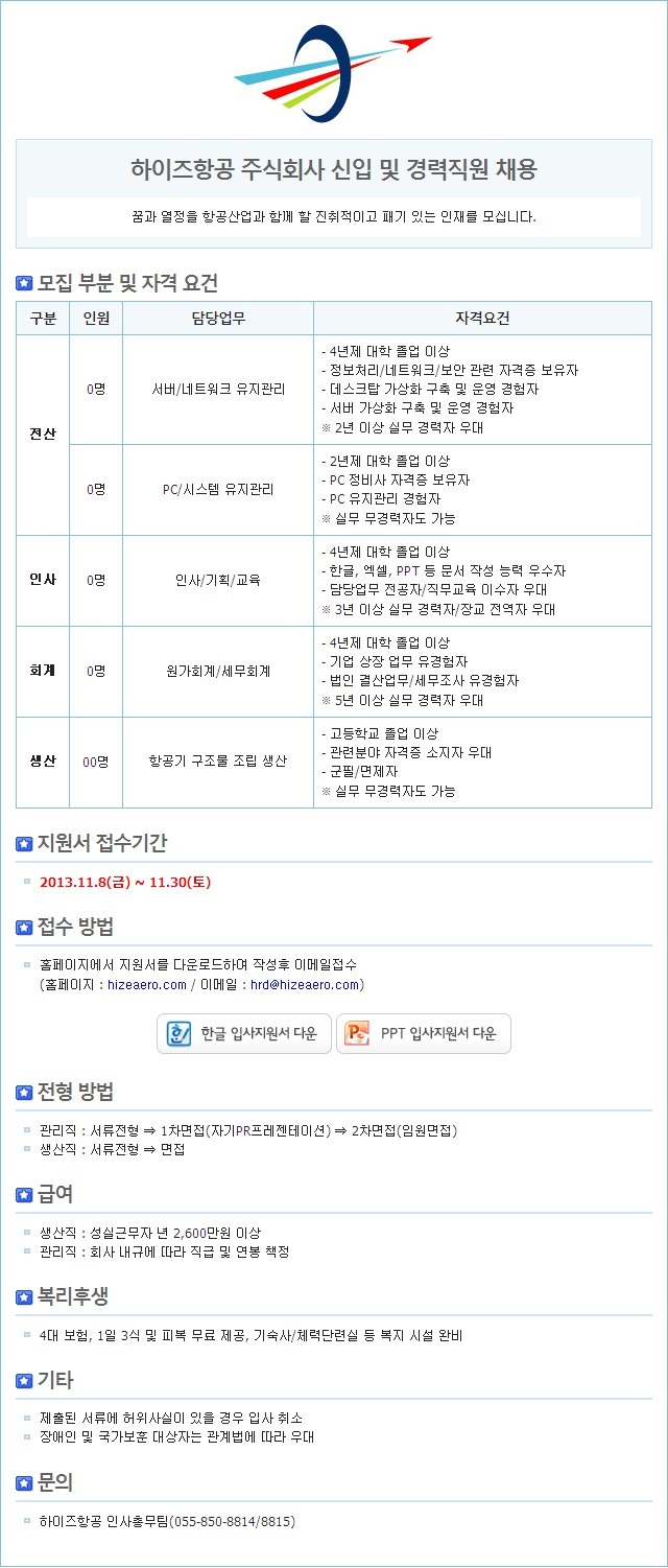 하이즈항공 채용 / 2013년 신입 및 경력직원 채용 (~11/30)