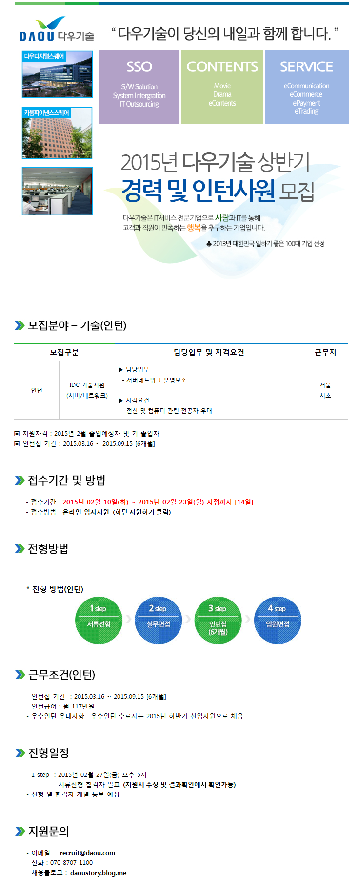 [신입]다우기술 채용 / 2015년 다우기술 상반기 인턴사원 모집 (~02/23) 작성자*기업공고맨*|작성시간15.02.10|조회수477 목록 댓글 0 글자크기 작게가 글자크기 크게가 다우기술 채용 / 2015년 다우기술 상반기 인턴사원 모집 (~02/23) 다우기술 채용 정보 알려드립니다! 드디어 다우기술 채용 공고가 떴으니, 미리미리 준비하셔서 다우기술 채용 지원하세요^_^ 닥치고 취업은 여러분의 다우기술 채용 합격을 기원합니다. ▼ 채용공고 ▶ 다우기술 채용 홈페이지 바로가기 ▶ IT·통신 l 전자·반도체 게시판 바로가기 다음검색 현재 게시글 추가 기능 열기 북마크 공유하기 신고 센터로 신고 댓글 댓글 0 댓글쓰기 답글쓰기 댓글 리스트