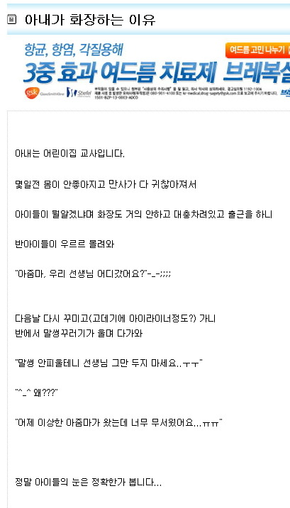 아내가 화장하는 이유 작성자닥취하는♣하얀평화♣|작성시간13.06.23|조회수977 목록 댓글 1 글자크기 작게가 글자크기 크게가 다음검색 현재 게시글 추가 기능 열기 북마크 공유하기 신고 센터로 신고 댓글 댓글 1 댓글쓰기 답글쓰기 댓글 리스트 작성자나는야짹짹이 | 작성시간 13.06.24 ㅋㅋㅋ 댓글 전체보기