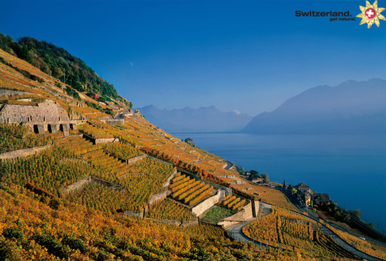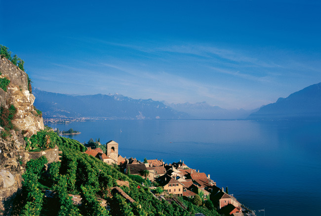 알프스와 레만호수를 배경으로 비탈진 언덕에 펼쳐진 계단식 포도밭,