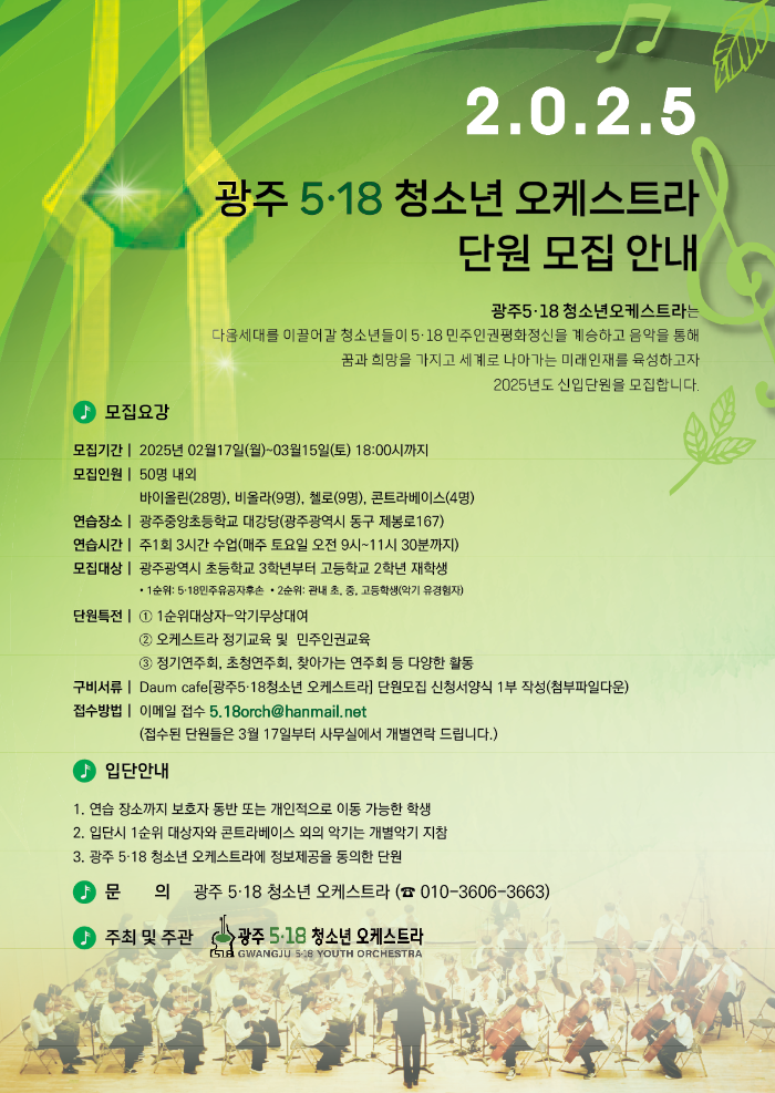 2025년 광주 5·18 청소년 오케스트라 단원모집 안내 작성자광주518청소년오케스트라|작성시간25.02.15|조회수977 목록 댓글 0 글자크기 작게가 글자크기 크게가 2025년광주518청소년오케스트라단원모집공고.pdf172.35KB2025년도광주518orch입단신청서 및 개인정보활용동의서.hwp110.50KB 첨부파일첨부된 파일이 3개 있습니다. etc 파일 blob 다운로드 hwp 파일 2025년도광주518orch입단신청서 및 개인정보활용동의서.hwp 다운로드 pdf 파일 2025년광주518청소년오케스트라단원모집공고.pdf 다운로드 다음검색 현재 게시글 추가 기능 열기 북마크 공유하기 신고 센터로 신고 댓글 댓글 0 댓글쓰기 답글쓰기 댓글 리스트