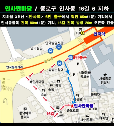 | ◈ 모임장소 인사한마당(안국역6번출구) * 인사한마당은 노래 시설도 잘 준비되어 있고 식사도 마장동에서 갓 공수된 맛난 한우 샤브샤브가 제공되고 안주도 육사시미, 전, 과일등 푸짐하게 준비되어 있으며 술은 무제한으로 제공되는 이번 모임에 최적화된 장소입니다. *이 자리를 섭외해 주신 제니퍼님께 감사 드립니다 |