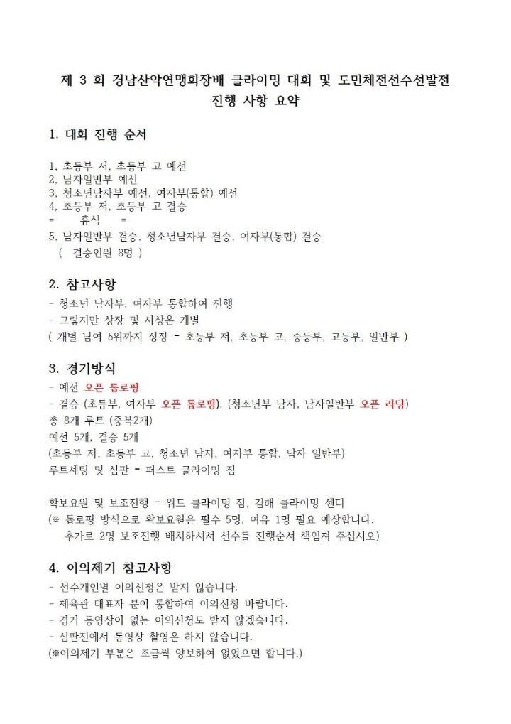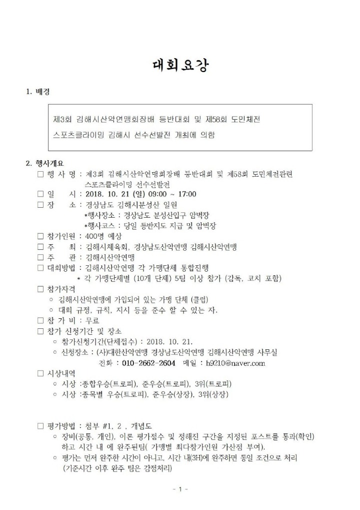 제3회 김해시 산악연맹등산대회 및 스포츠클라이밍 도민체전 선수 선발전을 아래와 같이 개최하고자 하오니 바쁘신 일정이라도 원활한 행사를 위하여 많이 참석하여 주시기를 바랍니다.