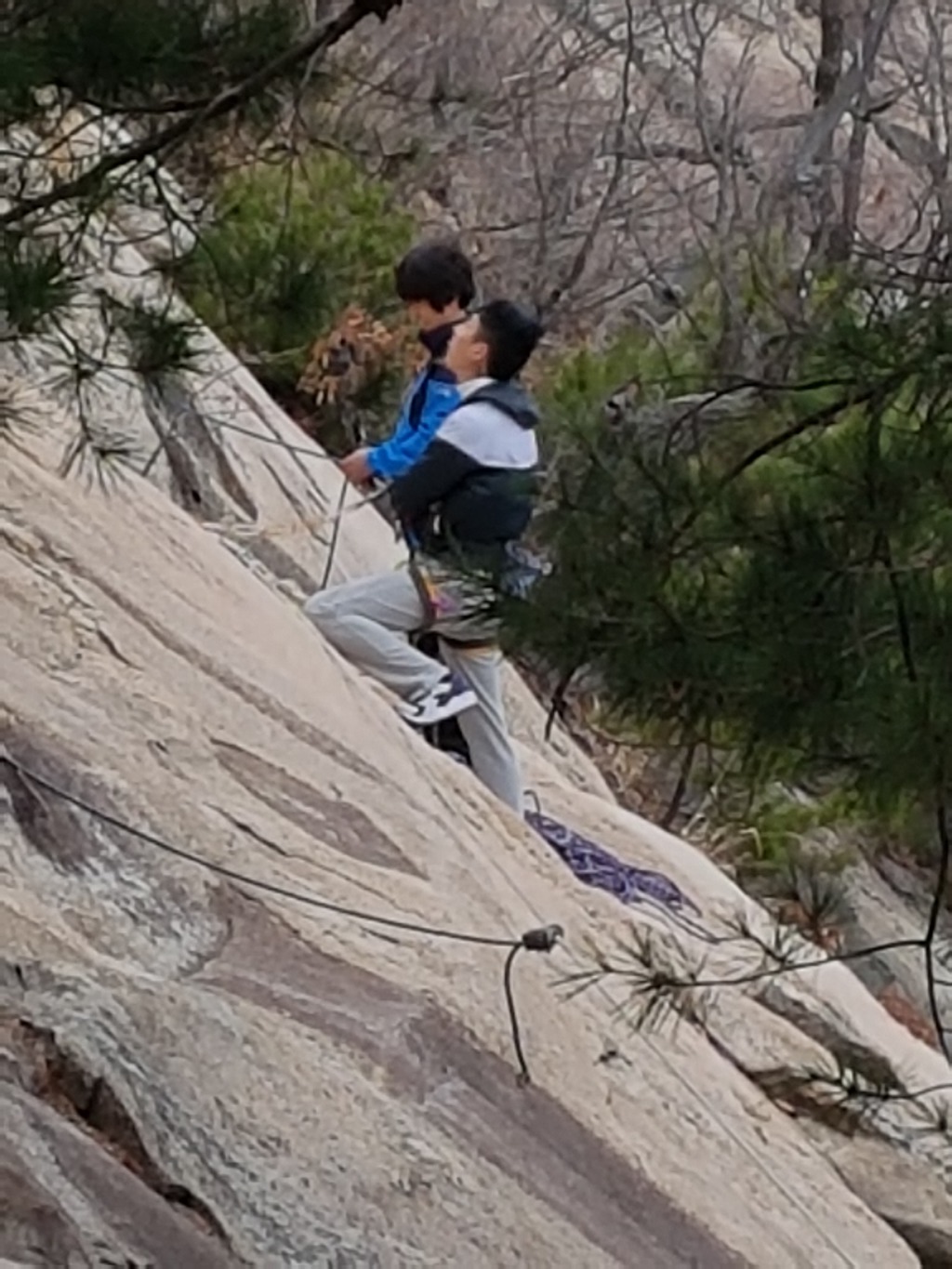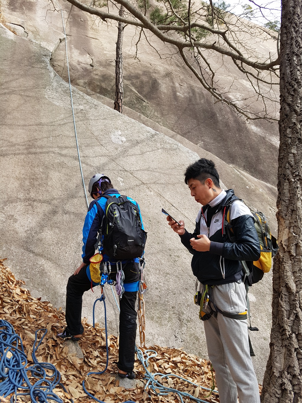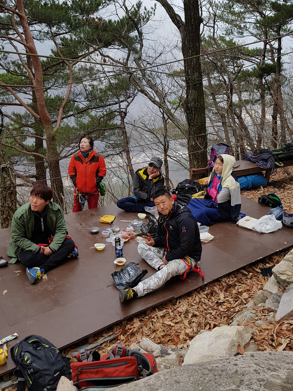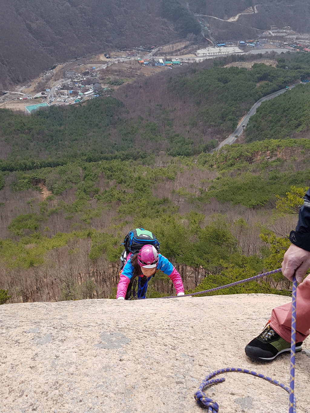 토요일까지 봄을 가다리는 우리의 마음과는 달리 겨울은 마지막 기승을부리듯 강한바람을 일으키며 우리의 마음을 뒤흔들었지만....그래도 고스톱을 좋아하는 우리네 한국사람들의 뚝심! 못먹어도 GO~~~~~라는 무대뽀정신을 앞세워 출발했다. 다행이 바람도 좀 자는거 같았고 기온도 그닥 차갑지않아 다행이었다. 우리팀의 다크호스(얼굴도 까맣다.) 재창이가 선등을 서서 줄을걸고 나와 두명만 시스템을 잘알고 나머지 7명은 완~죤 초짜들....대략난감 했지만~그래도 숙지가 잘돼는 친구들이니 믿고 .....처음해보는 릿지등반..날씨가 좋았으면 더욱 좋으련만 그래도 다들 열심히 즐겁게 때로는 두려움도있어보이고..한피치 한피치 가르치니 곧잘들한다. 머리가 꽝은 아닌듯....다행이 아무사고없이 모든피치를 끝내고 점심을 먹으려니 장소가 춥고 좁아서 중앙벽으로 이동해서 한백산악회가 설치해놓은 평상?에서 점심을 간단하게 먹고 중앙벽 등반을 일단 시작했다. 한피치를 하고 투피치를 오르려고보니 며칠전에 내렸던 비대문인가~~물이 흐르고 있잖은가~그곳이 투피치 처음도입부가 까리한곳이라 바람도 많이불고 오전부터 따라오던 시커먼 구름때문에 마음이 썩 내키지않아 다들 한마음으로 철수를 결정. 하산길에 평소에 산을 많이 오르지 않앟던 다은이는 다리에 힘이풀려 자꾸만 휘청휘청하다가 넘어지기도하고...참고로 우리팀의 제일 저질체력을 보유한 아가씨...그래도 깡은있음.그..다은이를 보필하는 늙은 총각들...우리 아줌마들도 같은 여자인데...ㅎㅎㅎ 괜히 결혼을했나~~~~ㅋㅋㅋ 왜이렇게 주차장이 머냐며 투덜대며 내려오는 지호. 생각보다 잘걷는다. 또다른 늙은 세총각들은 언능 내려가서 막걸리 학탁배기하고픈 맴으로 열심히 내려가다 주차장 5미터남기고 갑자기 나를 챙긴다는? 이런 속이훤이 들여다보이는 놈들. 그래도 잘들 내려왔으니 다들 고맙구먼~~~~담에는 좀더 힘든곳으로 등반가자규~~^^♡♡♡#삼방동어방동실내암벽#김해실내암벽#인제대근처실내암벽#동김해실내암벽장#김해대표실내암벽장