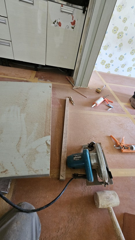 우리 시야에서 사라진 2곳의 문틀 위에는 온돌보드 6mm가 거실과 방,주방과 방을 견고하게 덮어버렸어요.