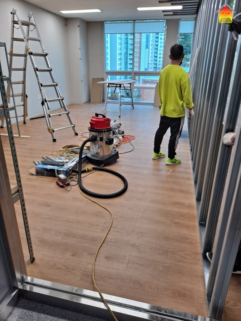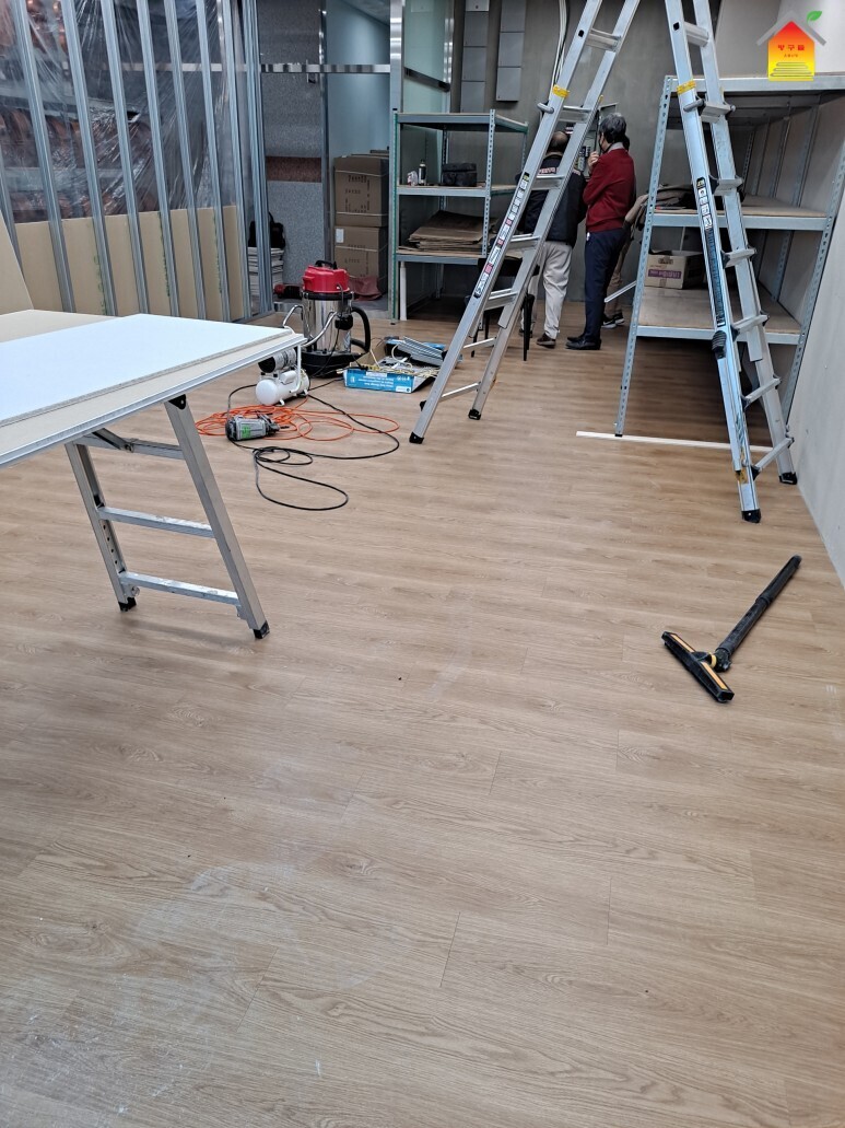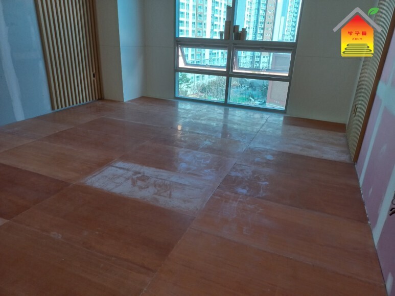 기존 비 난방 바닥 위에 덧 시공 방법으로 건식난방을 시공하는 사진입니다.