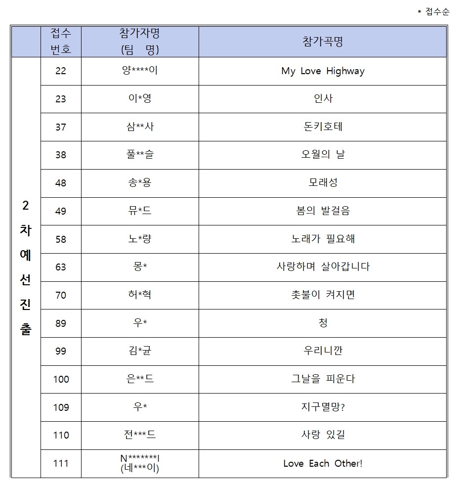 1차 음원 및 서류 심사 결과 2차 예선에서 만날 15곡(15팀)을 다음과 같이 알려드립니다.