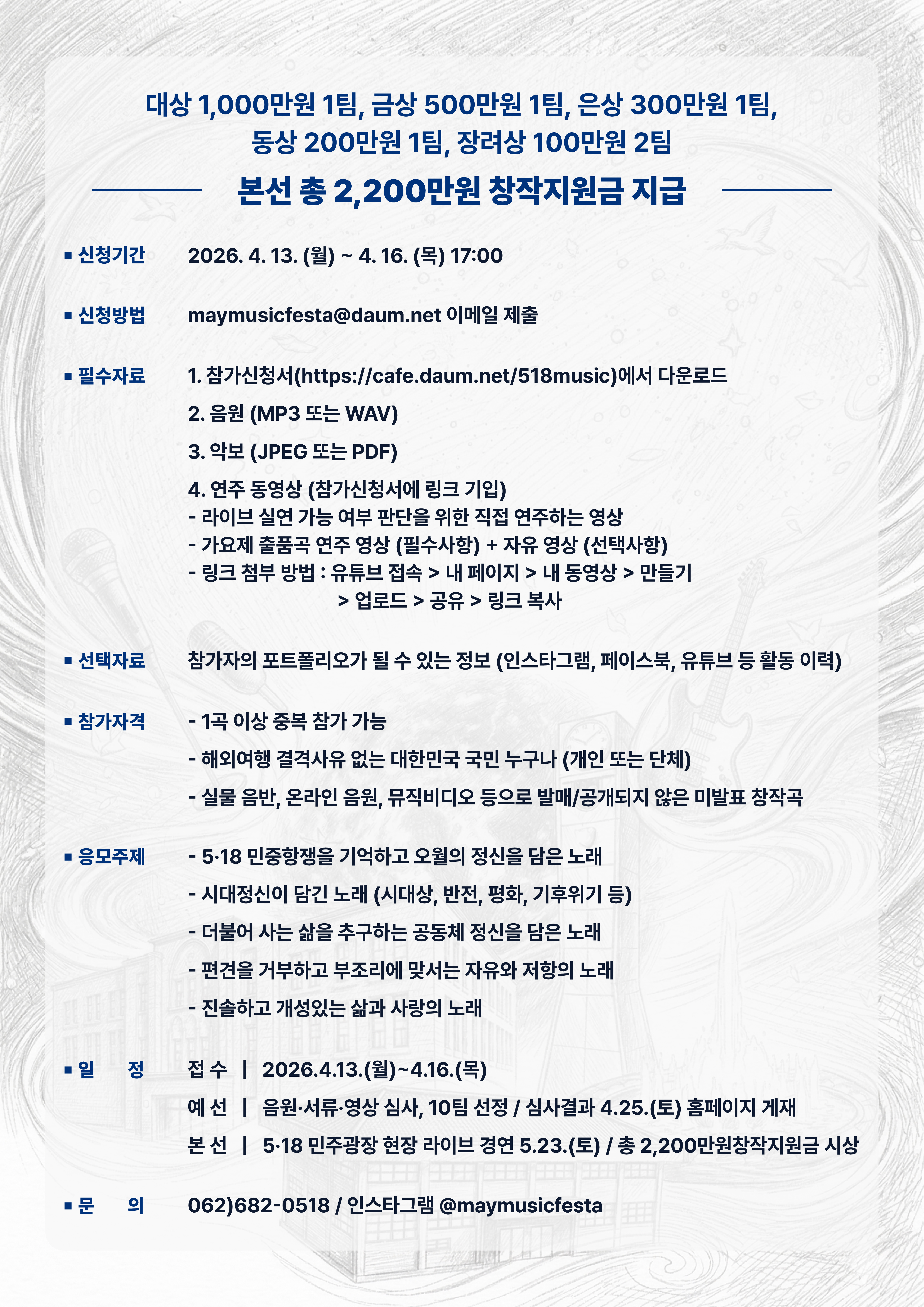 2026 제16회 전국오월창작가요제 참가자 모집 + 참가 신청서 다운로드 작성자오월음악|작성시간26.03.23|조회수145 목록 댓글 0 글자크기 작게가 글자크기 크게가 제16회_전국오월창작가요제_참가신청서_양식.hwp90.50KB 첨부파일첨부된 파일이 3개 있습니다. jpeg 파일 KakaoTalk_Photo_2026-03-23-12-56-52 002.jpeg 다운로드 jpeg 파일 KakaoTalk_Photo_2026-03-23-12-56-52 001.jpeg 다운로드 hwp 파일 제16회_전국오월창작가요제_참가신청서_양식.hwp 다운로드 다음검색 현재 게시글 추가 기능 열기 북마크 공유하기 신고 센터로 신고 댓글 댓글 0 댓글쓰기 답글쓰기 댓글 리스트