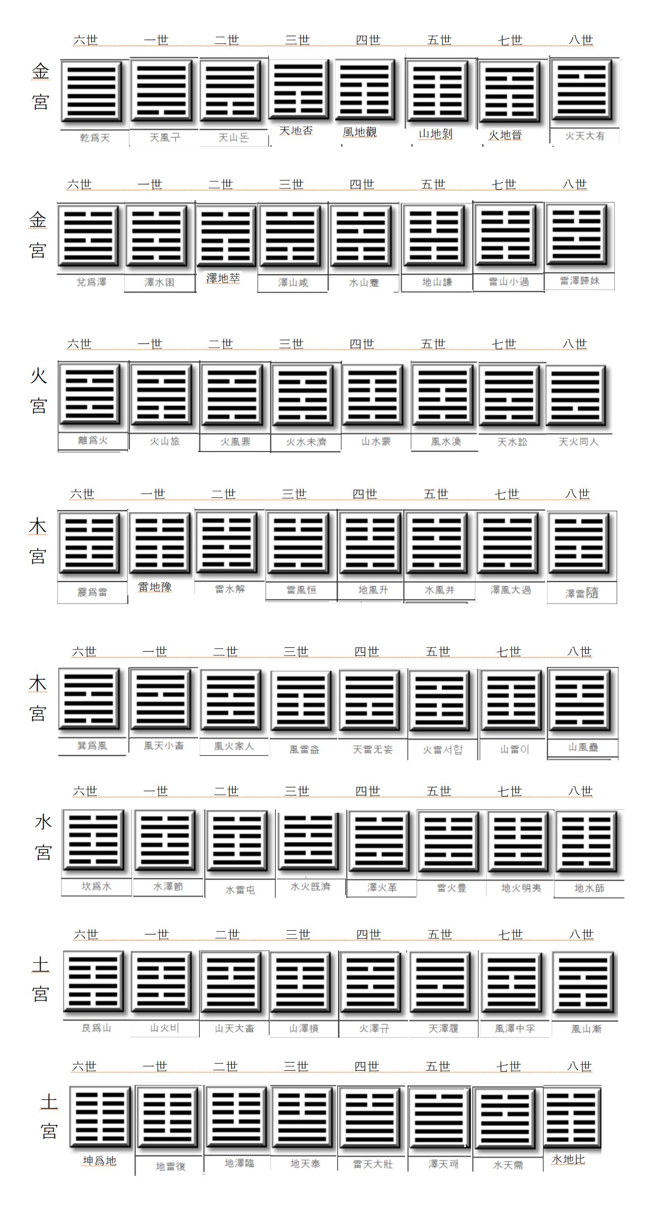 육세(六世)는 상효(上爻)에 일세(一世)는 초효(初爻)에 이세(二世)는 이효(二爻)에 삼세(三世)는 삼효(三爻)에 사세(四世)는 사효(四爻)에 오세(五世)는 오효(五爻)에 칠세(七世)는 사효(四爻)에 팔세(八世)는 삼효(三爻)에 있음