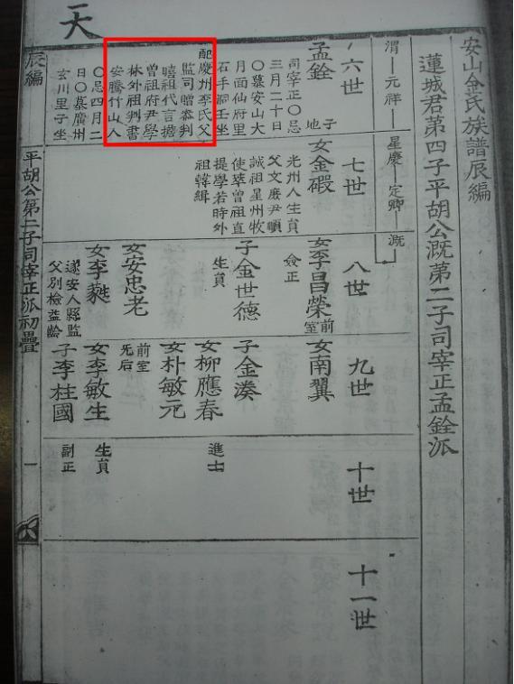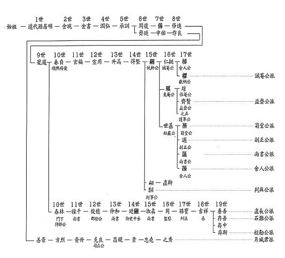 청호공 셋째 아들 제학공 문환 - 겸 - 농헌 우인 - 이유 - 형운,형욱 - 진남 - -
