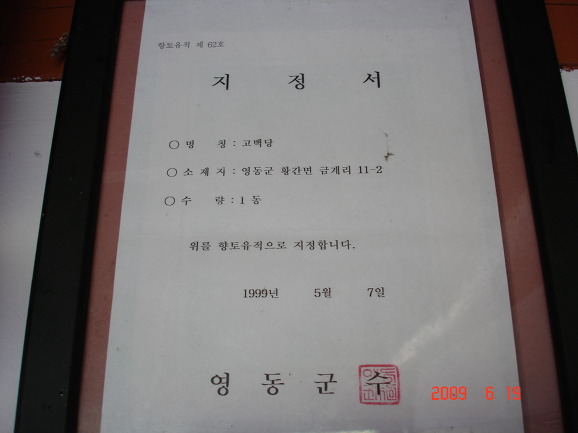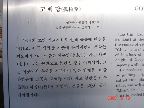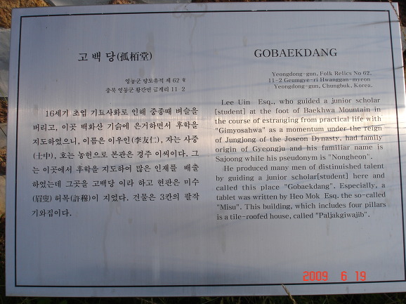 인재를 배출했는데 그곳을 고백당이라 하고 현판은 미수 허목이 지었다. 정면 3칸 측면 3칸 5량 팔작기와