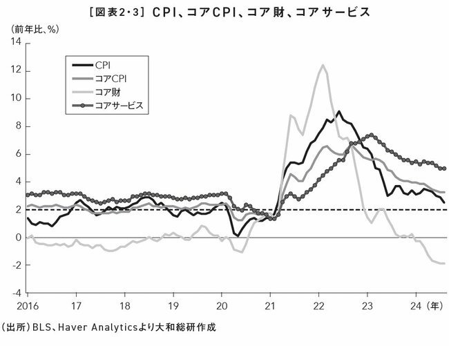 続いて、コロナ禍後の米国経済で最大の懸案事項だったインフレについて確認すると、8月の消費者物価指数(CPI)は前年比+2.5%となった(図表2・3)。